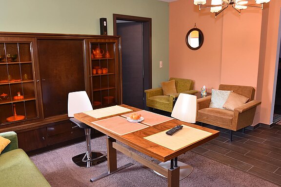 1 Küchen-Wohnraum inklusive Spülmaschine, Mikrowelle, Kühl-/Gefrierschrank, Kaffeemaschine und TV-Gerät